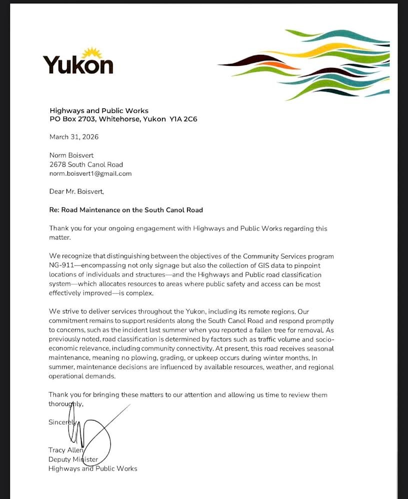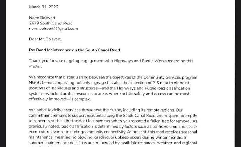 For years residents have reported dangerous road conditions on Hwy 6 (South Canol) to Director of Public Works. Those reports were ignored. Rather than address the hazards, the government has been misleading taxpayers about the quality of its road maintenance and portraying a false narrative of “good work” while failing this community. To note, it doesn't matter which party is elected, it is the bureaucracy that is responsible for the mismanagement of each and every department.